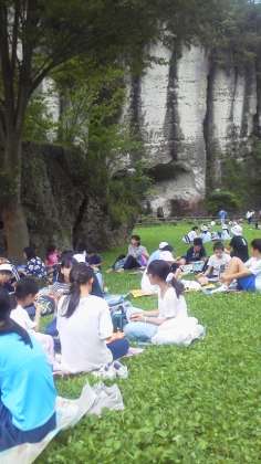 大谷資料館わきの草地で、お弁当を食べています。曇り空の下、風が涼しいです。
