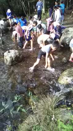 子どもと鱒の勝負です。どっちが勝つかな・・