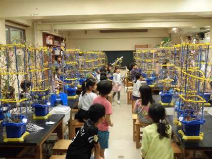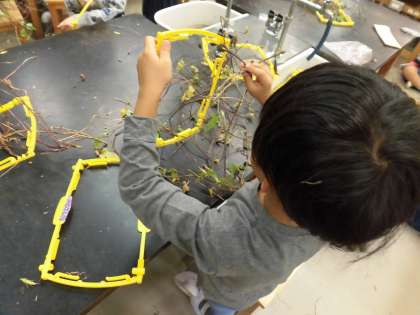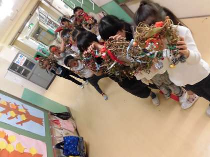 前回、チューリップを植えたお話はしましたが・・・アサガオはどうなったのでしょう。記事の中でも少々触れましたが、アサガオのツルでリースを作りました。入学してからずっと育ててきたアサガオに「今まで、ありがとう。」「新しい種で、また育てるね。」と一人ひとりが声をかけ、リース作りをスタート。アサガオのツルを輪にしながら、余った部分を巻き付けて形を作っていきます。数日置き、少し固くなったところで、ビーズやリボン、また秋探しで拾ってきたドングリや落ち葉で飾り付けをしていきました。完成したリースはまさに桜梅桃杏《みんなちがって、みんないい!!》、素敵なリースができました。