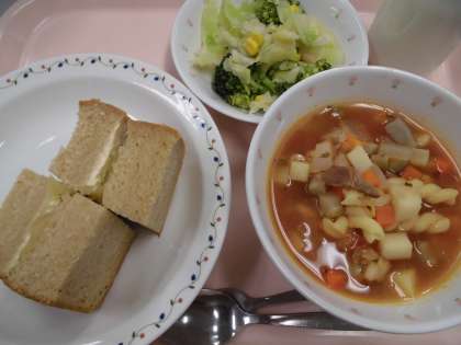 手作りりんごジャムのサンドイッチ、根菜のミネストローネ、グリーンサラダ、牛乳