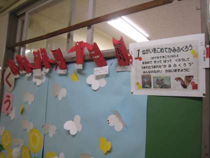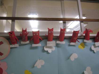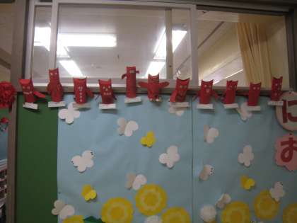 1年生が「ねがいをこめてかみふくろう」という図工作品を制作しました。子どもたちの様々な願いが込められたふくろうが賑やかに飾られています。