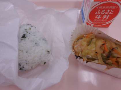 わかめおにぎり、鮭のチャンチャン焼き、牛乳