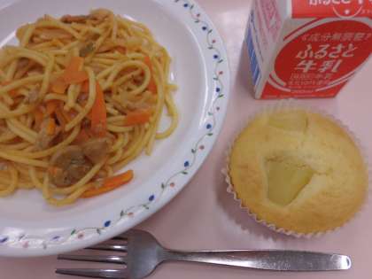 スパゲッティナポリタン、パインケーキ、牛乳