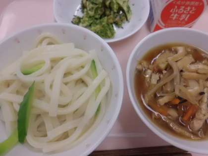 五目冷やしうどん、青のりポテトビーンズ、牛乳