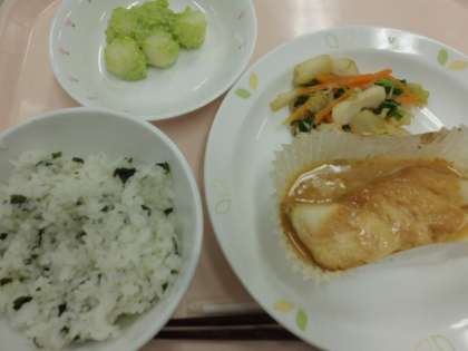わかめごはん、白身魚のみそマヨネーズ焼き、笹かまぼこ入り煮びたし、ずんだもち、牛乳