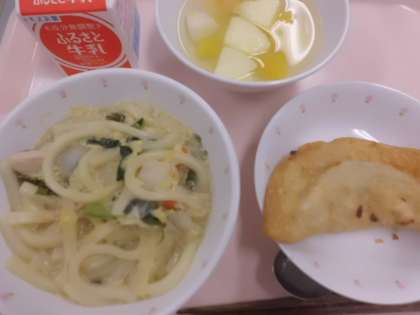 かきたまうどん、ジャンボぎょうざ、秋のフルーツポンチ、牛乳