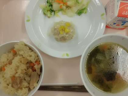 中華おこわ、花しゅうまい、辣白菜、わかめスープ、牛乳