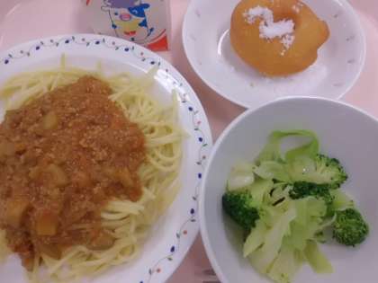 根菜入りミートソーススパゲッティ、ブロッコリーのカレーサラダ、手作りドーナッツ、牛乳
