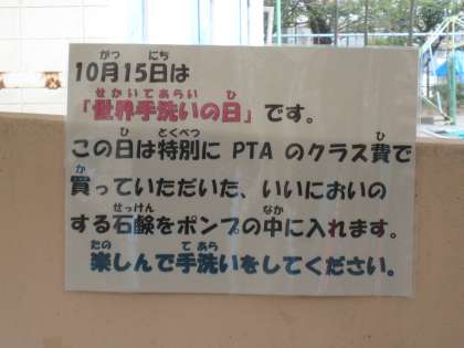 10月15日は、ユニセフが提唱する国際的な取組「世界手洗いの日」です。石鹸を使った手洗いは、新型コロナウイルス感染症・インフルエンザ・風邪などを防ぐ効果的な予防対策のひとつです。本日は、PTAのクラス費で購入していただいた「いい香りで泡立ちがいい石鹸」を初めて使わせていただきました。子どもたちは、いつもの石鹸との違いに驚きながら朝の手洗いをしています。