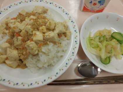 麻婆豆腐丼、野菜の中華風味、牛乳