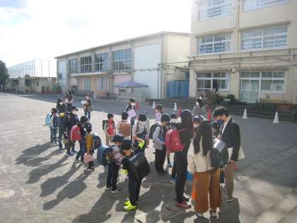 10月21日、地区班による集団下校を行いました。災害や緊急時を想定して、子どもたちが速やかに行動するとともに、各地区班の集合場所・解散場所を確認することが目的です。PTA校外委員の皆様に各班の担当としてお手伝いいただきました。ありがとうございました。