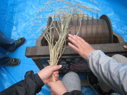 先週に引き続き、世田谷アドベンチャークラブから2名のゲストティーチャーをお招きして、5年生が「総合的な学習の時間」に稲の脱穀を体験しました。子どもたちは自ら刈った稲を脱穀機にかけ、日常的には味わえない農業体験ができました。少量ですが、各家庭にお米を持ち帰りますので、収穫の秋を味わってください。