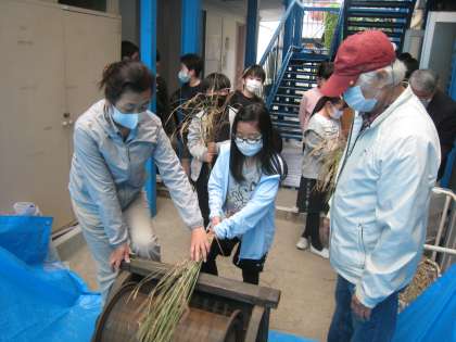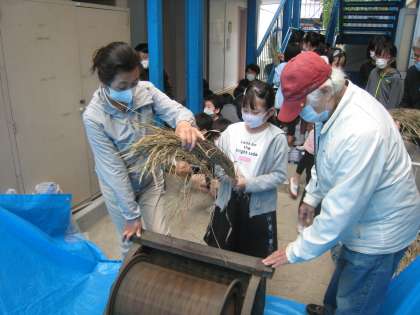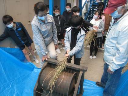 先週に引き続き、世田谷アドベンチャークラブから2名のゲストティーチャーをお招きして、5年生が「総合的な学習の時間」に稲の脱穀を体験しました。子どもたちは自ら刈った稲を脱穀機にかけ、日常的には味わえない農業体験ができました。少量ですが、各家庭にお米を持ち帰りますので、収穫の秋を味わってください。
