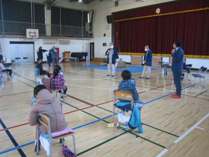 11月10日、4年生が総合的な学習の時間に、三土代会幹事の方4名をお招きして、第2回「三土代会との交流学習」を行いました。先週の授業を活かし、実際に杵を使ってシミュレーションで餅つき体験を全員が行いました。代表児童が三土代会の衣装を着させていただき、雰囲気を味わいました。子どもたちは、幹事の方たちの話を興味津々に聞き、代田地区に受け継がれてきた伝統を保存・継承することの大切さを学びました。