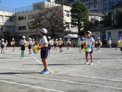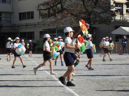秋晴れの空の下、子どもたちは短距離走でベストを尽くして走りました。表現運動では今までの練習の成果を生かして「百花繚乱」を発表しました。子どもたち一人一人が作った色とりどりの花をあしらった花笠を被り、腰をしっかり落として花笠音頭を踊りきりました。保護者の皆様の温かい拍手が校庭に響き、清々しいスポーツの秋となりました。