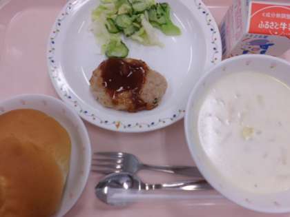 ミルクパン、ハンバーグ、グリーンサラダ、ポテトスープ、牛乳