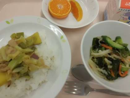 「タッカルビ」は、韓国料理のひとつで、甘辛いたれで野菜や肉を炒めた料理です。くだものは、柑橘の食べ比べにしました。温州みかんと、早香(温州ミカンとポンカンの掛け合わせ)を提供しています。