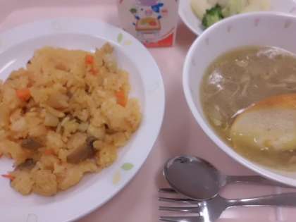 チキンライス、ソーセージとポテトの香草焼き、オニオングラタンスープ、牛乳