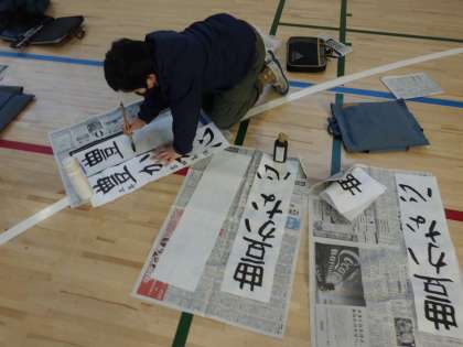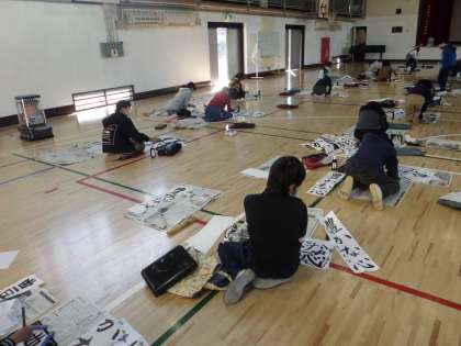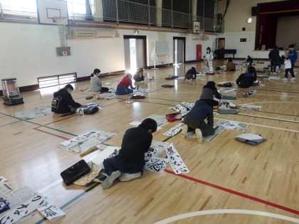 1月13日、5年生による席書会を体育館にて行いました。「日本の伝統的な年中行事に親しみ、新年の学習始めの一つとして、穂先の動きと点画のつながりを意識して書く。」ことを目標に取り組みました。子どもたちは、厳かな雰囲気の中で、真剣に書写に向き合いました。滑らかに筆を走らせる緊張感が漂っていました。