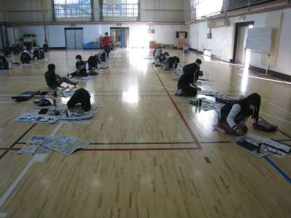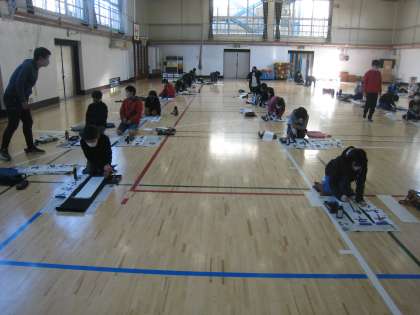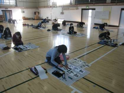 1月14日、6年生による小学校生活最後の席書会を体育館にて行いました。「日本の伝統的な年中行事に親しみ、新年の学習始めの一つとして、穂先の動きと点画のつながりを意識して書く。」ことを目標に取り組みました。子どもたちは、厳かな雰囲気の中で、真剣に書写に向き合いました。滑らかに筆を走らせる緊張感が漂っていました。