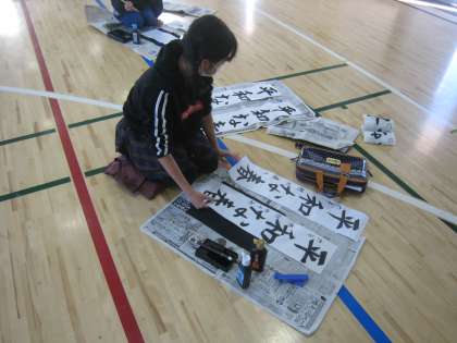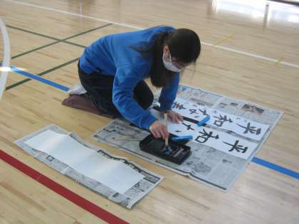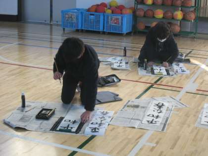 1月14日、6年生による小学校生活最後の席書会を体育館にて行いました。「日本の伝統的な年中行事に親しみ、新年の学習始めの一つとして、穂先の動きと点画のつながりを意識して書く。」ことを目標に取り組みました。子どもたちは、厳かな雰囲気の中で、真剣に書写に向き合いました。滑らかに筆を走らせる緊張感が漂っていました。