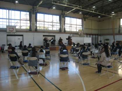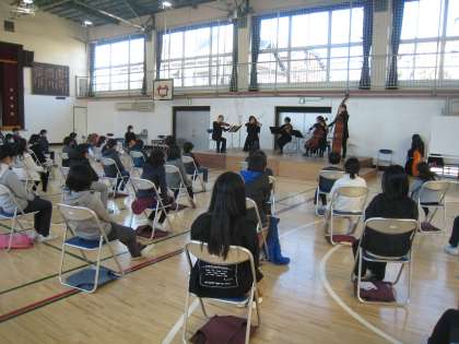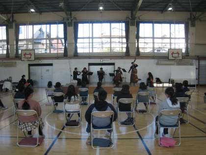 1月20日、5年生対象に小学校音楽鑑賞教室を実施しました。今年度はコロナ禍のためホールでの演奏会ではなく各学校の体育館での開催になりました。東京フィルハーモニー交響楽団の音楽家の方たちに演奏を聴かせていただきました。バイオリン、チェロ、ビオラ、コントラバスによる弦楽五重奏は大変素晴らしく、子どもたちの心を潤す美しい演奏会でした。
