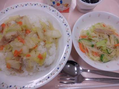 白菜と豚肉のあんかけごはん、春雨サラダ、ごまだれもち、牛乳