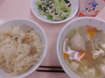 里芋ごはん、八丈島産目鯛のつみれ汁、切り干し大根のソテー、牛乳
