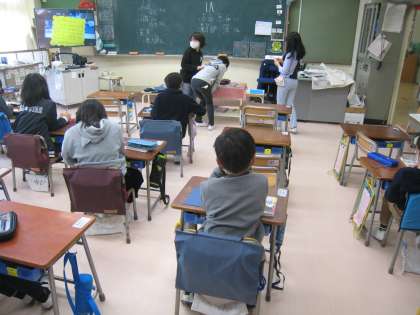 2月15日、6年生に代わり5年生がリーダーとなって縦割り班活動を行いました。活動内容は「卒業生ありがとうメッセージカード」の作成です。今までお世話になった6年生に向けて、1〜5年生が心を込めて思いを書きました。