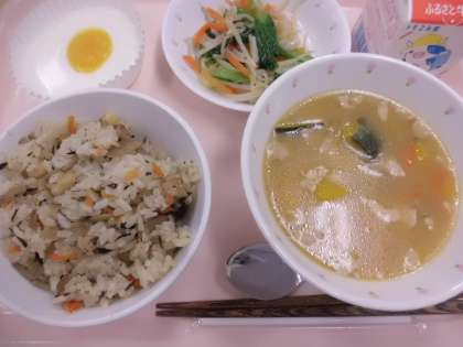 五目ごはん、おひたし、柴田先生のみそ汁、おかしな目玉焼き、牛乳