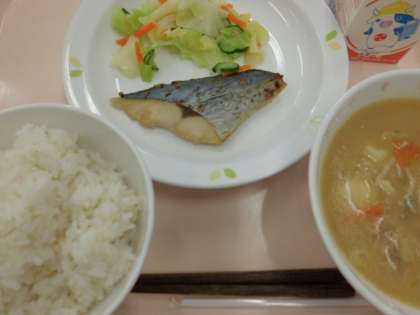 麦ごはん、鰆の香味焼き、ひとしお野菜、だご汁(佐賀県郷土料理)、牛乳