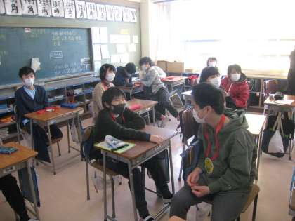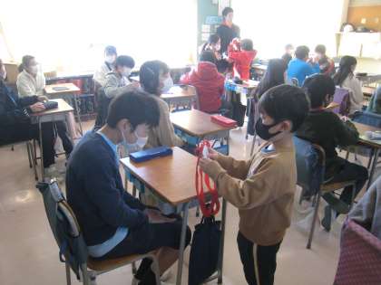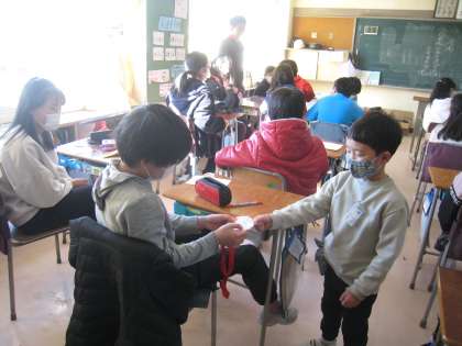 3月3日、6年生を送る会に先駆けて、朝の会の時間に、1年生が感謝の気持ちを込めて作ったメダルを一人一人に渡しました。突然のプレゼントに6年生は喜んでいました。