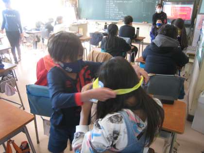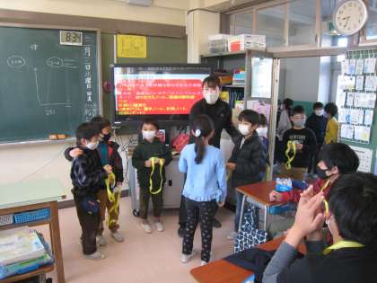 3月3日、6年生を送る会に先駆けて、朝の会の時間に、1年生が感謝の気持ちを込めて作ったメダルを一人一人に渡しました。突然のプレゼントに6年生は喜んでいました。