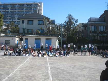 3月3日、新型コロナウイルス感染症対策のため、早春の空の下、校庭で6年生を送る会を行いました。各学年からは、1年生「メダルのプレゼント」、2年生「似顔絵のプレゼント」、3年生「メッセージパズル」、4年生「6年生にインタビュー」、5年生「縦割り班・寄せ書き贈呈」を心を込めて贈呈・発表しました。6年生からは卒業制作の雑巾を全学級へプレゼントし、学級ごとに練習してきた合奏(1組「全力少年」、2組「新世界」)を披露しました。従来とは違う形の行事になりましたが、子どもたちは心を通わせ和やかな時間を共有できました。