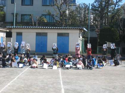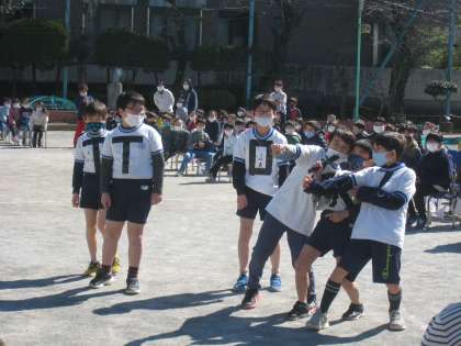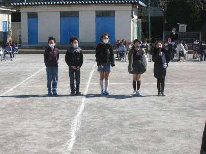 3月3日、新型コロナウイルス感染症対策のため、早春の空の下、校庭で6年生を送る会を行いました。各学年からは、1年生「メダルのプレゼント」、2年生「似顔絵のプレゼント」、3年生「メッセージパズル」、4年生「6年生にインタビュー」、5年生「縦割り班・寄せ書き贈呈」を心を込めて贈呈・発表しました。6年生からは卒業制作の雑巾を全学級へプレゼントし、学級ごとに練習してきた合奏(1組「全力少年」、2組「新世界」)を披露しました。従来とは違う形の行事になりましたが、子どもたちは心を通わせ和やかな時間を共有できました。