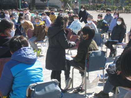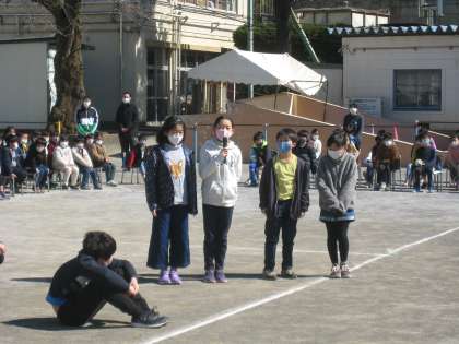 3月3日、新型コロナウイルス感染症対策のため、早春の空の下、校庭で6年生を送る会を行いました。各学年からは、1年生「メダルのプレゼント」、2年生「似顔絵のプレゼント」、3年生「メッセージパズル」、4年生「6年生にインタビュー」、5年生「縦割り班・寄せ書き贈呈」を心を込めて贈呈・発表しました。6年生からは卒業制作の雑巾を全学級へプレゼントし、学級ごとに練習してきた合奏(1組「全力少年」、2組「新世界」)を披露しました。従来とは違う形の行事になりましたが、子どもたちは心を通わせ和やかな時間を共有できました。