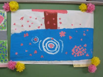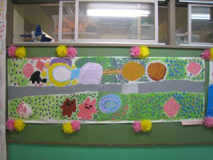 4年生が図工の授業ででつくった共同製作の作品が校内に展示されています。テーマは「春」、大胆な形のとらえ方や筆使いから子どもたちが感じる春の息吹が伝わってきます。