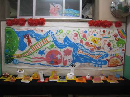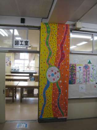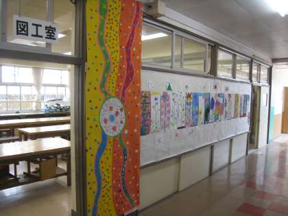 4年生が図工の授業ででつくった共同製作の作品が校内に展示されています。テーマは「春」、大胆な形のとらえ方や筆使いから子どもたちが感じる春の息吹が伝わってきます。