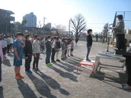 晴れ渡る空の下、五分咲きの桜が春の訪れを告げています。早春の校庭で、令和2年度 第3学期 ねづやま夢の学び舎 世田谷区立代田小学校 修了式を行い、各クラスの代表児童が校長先生から修了証を授与されました。児童代表の言葉は、2名の1年生がしっかりと発表しました。全校児童は、校長先生のお話しなどを静かに聞いて、1年間の自分の成長を振り返り、立派な態度で修了式に臨みました。