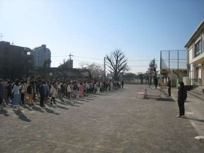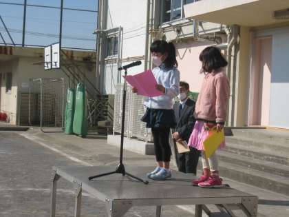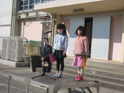晴れ渡る空の下、五分咲きの桜が春の訪れを告げています。早春の校庭で、令和2年度 第3学期 ねづやま夢の学び舎 世田谷区立代田小学校 修了式を行い、各クラスの代表児童が校長先生から修了証を授与されました。児童代表の言葉は、2名の1年生がしっかりと発表しました。全校児童は、校長先生のお話しなどを静かに聞いて、1年間の自分の成長を振り返り、立派な態度で修了式に臨みました。
