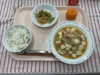 ごはん、にんじんふりかけ、たらのカレー揚げ、大根サラダ、瓜田先生のみそ汁、牛乳