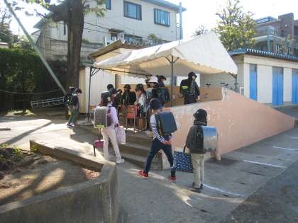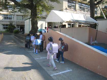4月8日、PTA役員2名の方が、あいさつ週間(4/6〜4/10)の取組のため正門で子どもたちに声かけをしています。登校後、子どもたちは手洗いをしてから校舎内へ入ります。2〜6年生は習慣になっているので、流しの前に並び、すみやかに手洗いできます。1年生は慣れていないので、まだ動きがぎこちないですが、上級生が優しくアドバイスしてくれたり、教職員に手助けしてもらいながら手洗いしています。