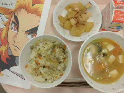 炊き込みごはん、冨岡義勇の鮭大根、煉獄杏寿郎のさつまいものみそ汁、牛乳