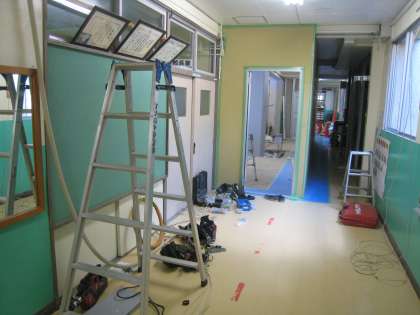 夏季休業期間中、校舎棟の耐震工事をしています。猛暑の中、工事関係者の方たちが汗をぬぐいながら取り組んでいます。8月中には職員室・音楽室・図工室の工事が終わる予定です。