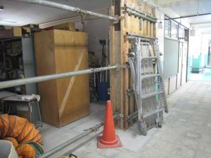 夏季休業期間中、校舎棟の耐震工事をしています。猛暑の中、工事関係者の方たちが汗をぬぐいながら取り組んでいます。8月中には職員室・音楽室・図工室の工事が終わる予定です。
