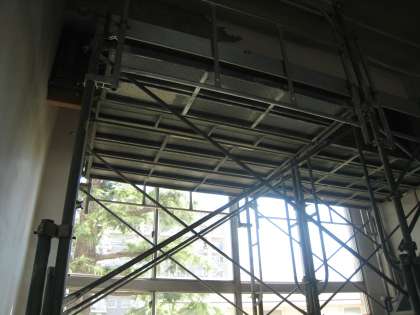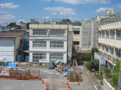 夏季休業期間中、校舎棟の耐震工事をしています。猛暑の中、工事関係者の方たちが汗をぬぐいながら取り組んでいます。8月中には職員室・音楽室・図工室の工事が終わる予定です。