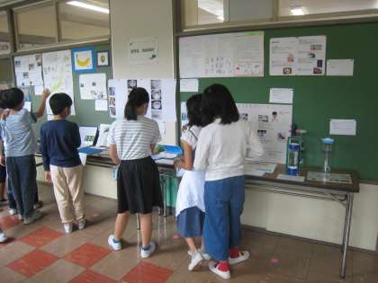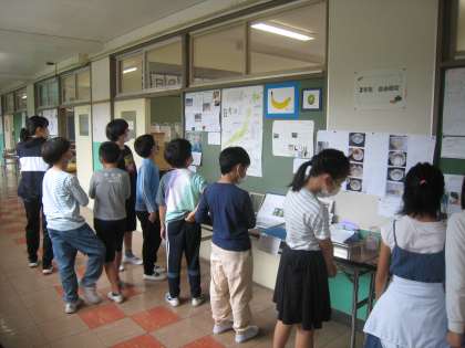 子どもたちが夏休みに作った力作が勢揃いして、夏休み作品展が始まりました。大きな工作、よく調べてまとめたレポートや壁新聞、記録写真などが所狭しと並んでいます。夏休み中の子どもたちの様子を垣間見られた気がします。保護者・地域の皆様にご来校いただけないのが残念です。各クラスの展示風景は後日ご紹介します。