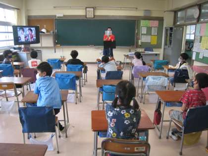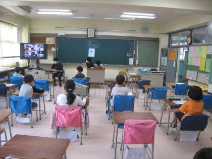 9月6日、分散登校2日目は、Bグループの子どもたちが登校して、Aグループの子どもたちは自宅学習です。朝の会では、各担任がTeamsアプリを活用して、自宅にいる子どもたちの健康観察も行いました。