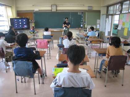 9月6日、分散登校2日目は、Bグループの子どもたちが登校して、Aグループの子どもたちは自宅学習です。朝の会では、各担任がTeamsアプリを活用して、自宅にいる子どもたちの健康観察も行いました。
