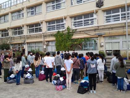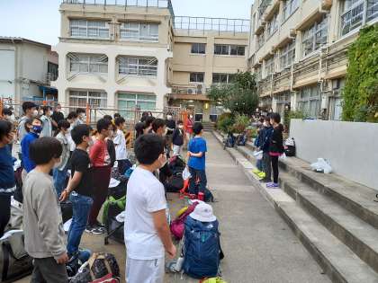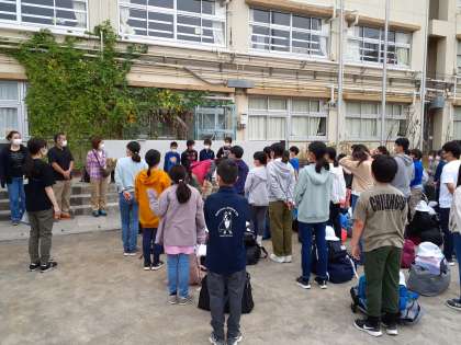 10/7、5年生の川場移動教室1日目。皆、集合時間より早く集まりました。司会担当の児童の進行で出発式が行われました。